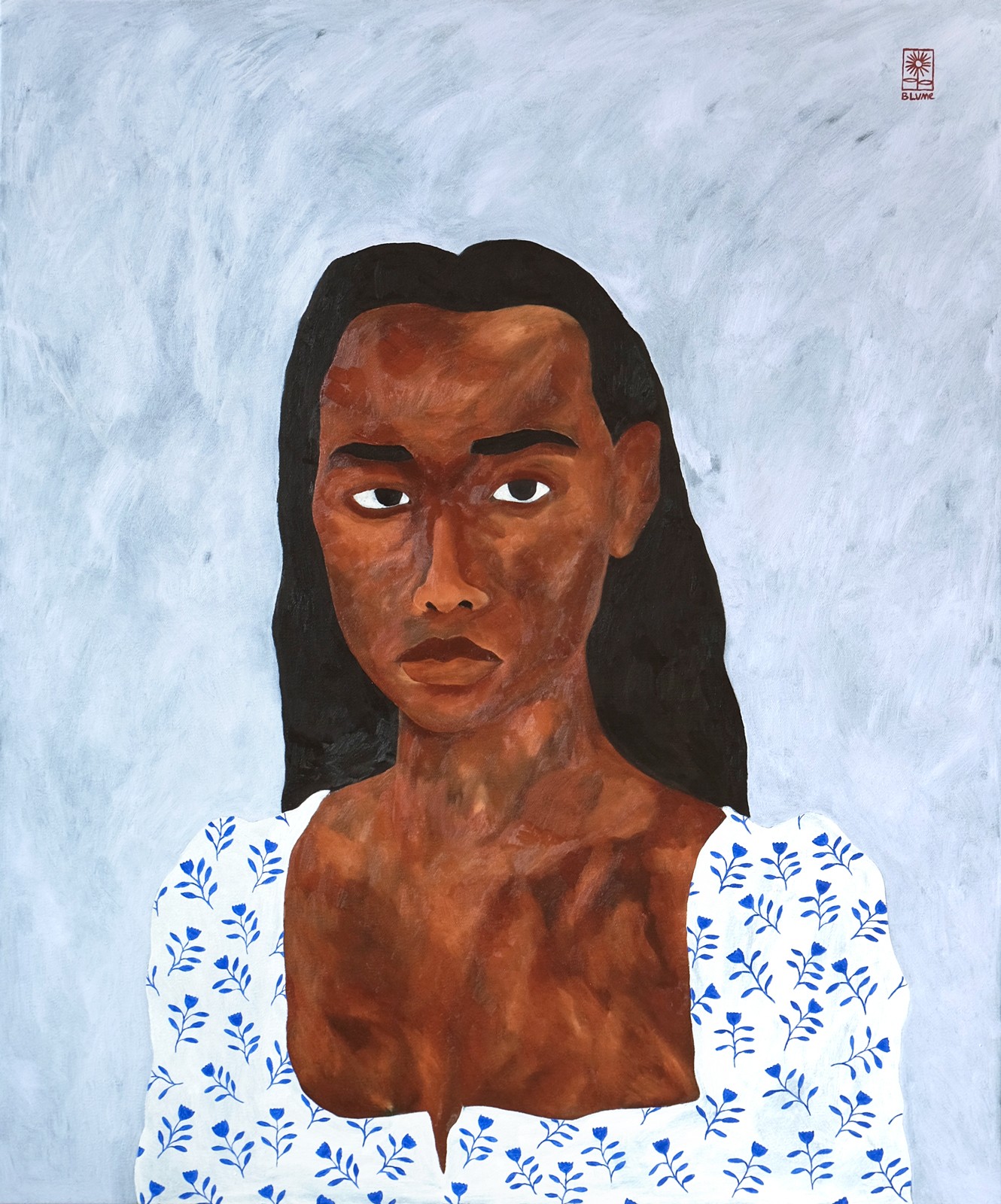 When you stand in front of one of Blume’s paintings, you immediately make eye contact with these people. There is the Man with pearl necklace. He wears a light long-sleeved shirt, and from his collar a white pearl necklace peeks out. There is a woman, resting her chin on her hand. She wears a floral dress; she is the Woman with floral pattern dress. Both the black man with the pearl necklace and the blonde woman in the flowery dress look directly at us. Then there are the others. They gaze into the distance, appearing lost in thought or dreamy. Just like the young man in the painting titled Dreaming in a Floral Sweater.